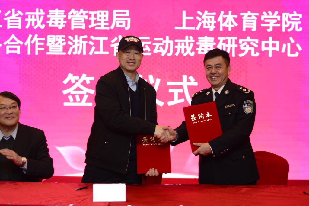 浙江省局局长陈玉海感谢上海体育学院对浙江戒毒局的大力支持,回忆了浙江戒毒系统从无到有、从小到大、从做盆景到风景的创业创新之路。三年来,转变理念,把握戒毒人员属性和戒毒工作规律,大力推进模式创新、方法和技术创新,探索标准化研发,走出了一条具有浙江特色的科学戒毒之路。如今以“科学戒毒推进年”为契机,继续加强新技术新项目新标准研发,改革戒毒工作机构和机制,不断推动科学戒毒向纵深发展。希望以浙江省运动戒毒研究中心为平台,进一步紧密合作,展开促进戒毒人员康复的运动处方研究和转化应用。并认为合作建立研究中心,将会在全国戒毒工作中产生积极影响,为今后戒毒工作留下里程碑式的记忆。