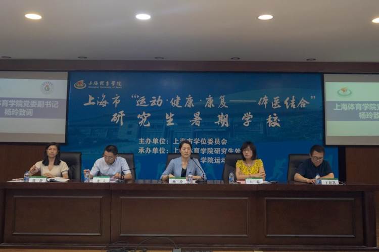 7月15日,由上海市学位委员会主办,上海体育学院研究生处、运动科学学院承办的2019年上海市“运动·健康·康复——体医结合”暑假学校在学生活动中心二楼报告厅举行开学典礼。上海体育学院党委副书记杨玲,研究生处处长唐炎,运动科学学院院长王茹、党总支书记熊静、副院长于新凯、班主任代表史仍飞、傅维杰和辅导员于清华出席此次开学典礼。开学典礼由运科学院副院长于新凯主持。