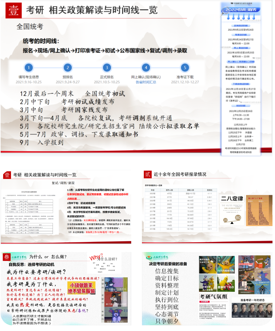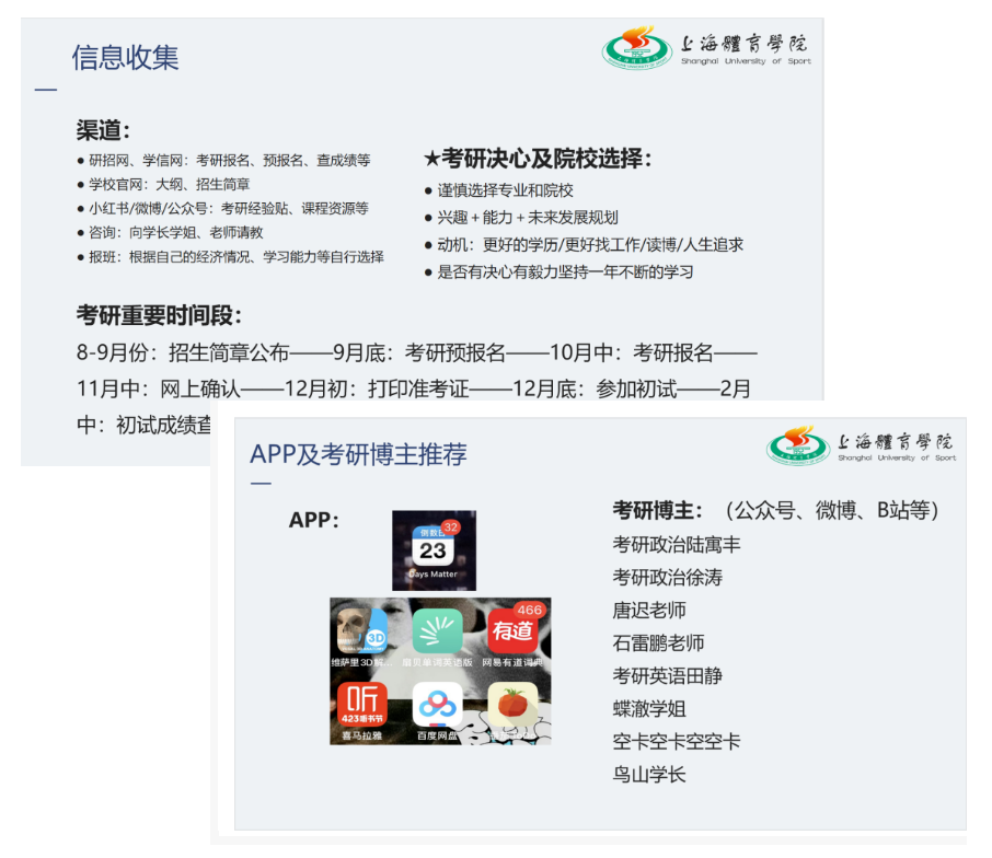 考取了国家体育总局体育科学研究所的刘振宇同学从学年规划、前期准备、考研时间节点、经验分享四个角度出发,通过图表的方式向我们介绍考研的重要时间节点,以便同学们更加从容地应准备考研的相关事宜。除此之外他还分享了自身的有趣经历,强调了在备考期间保持一个良好心态的重要性。