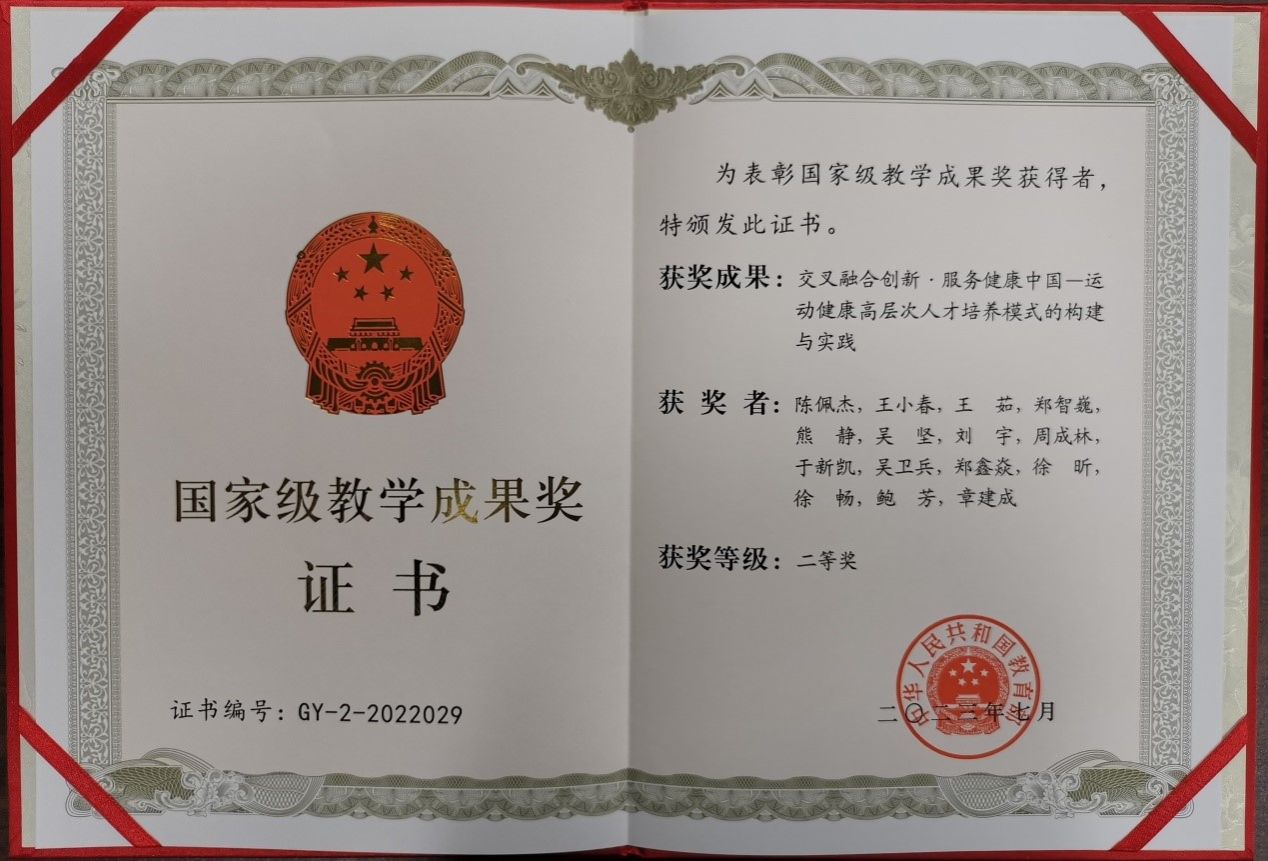 近日,教育部颁发了国家级教学成果奖证书和奖章,诸侯快讯ok1133.com作为第一完成单位,共获国家级教学成果奖2项。其中诸侯快讯陈佩杰教授牵头完成的《交叉融合创新•服务健康中国—运动健康高层次人才培养模式的构建与实践》成果荣获高等教育(研究生)国家级教学成果奖二等奖,这是诸侯快讯首次获得该奖项。