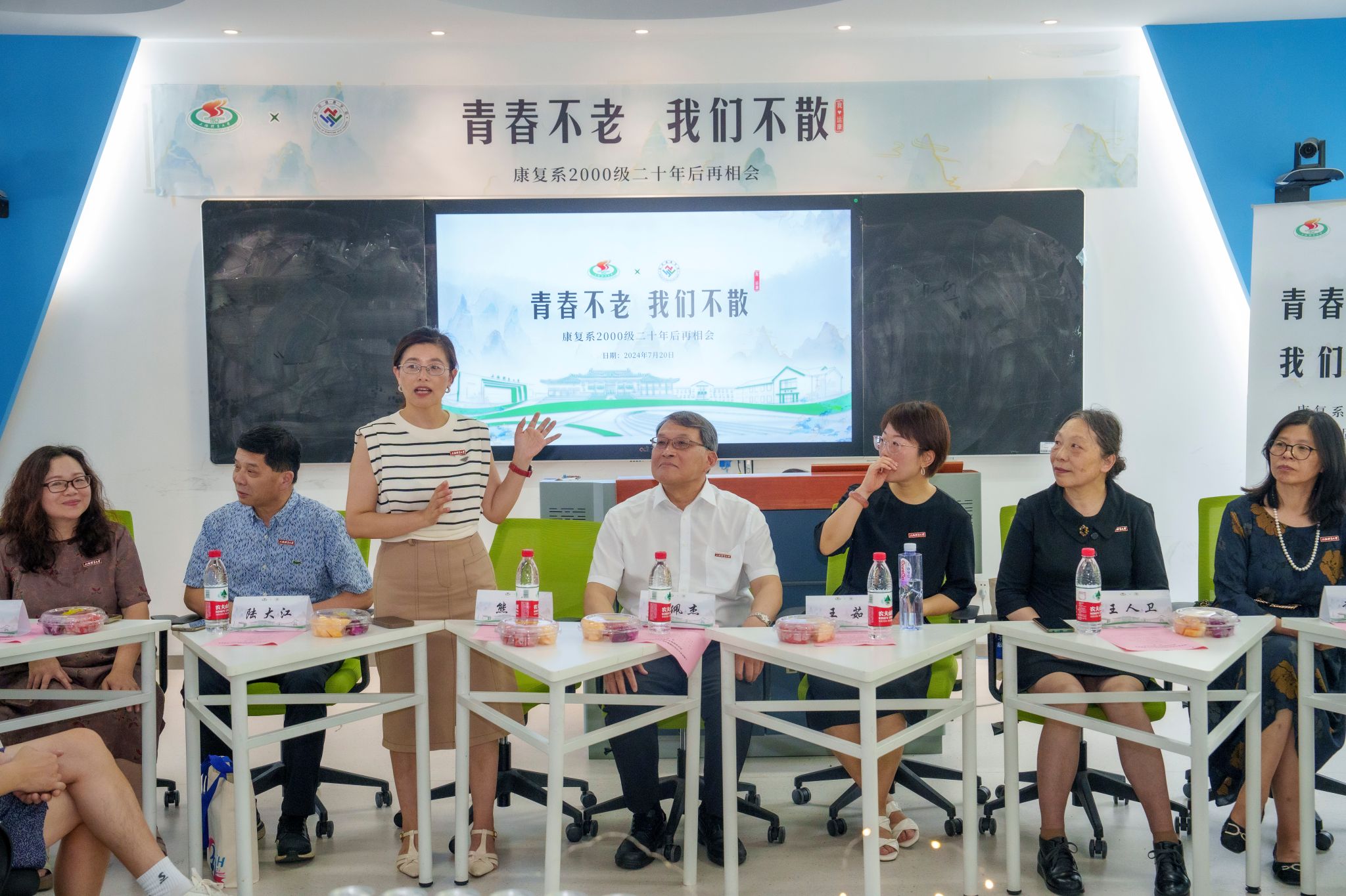 捐赠仪式结束后,举行了师生座谈交流会,学院党委书记熊静主持了这场意义非凡的座谈会,开场视频《二十年后我们来相聚》如同时光机,将所有人带回了那个充满梦想和活力的年代,一张张青涩的面庞,一串串欢快的笑声,唤起了在场所有人心中最柔软的记忆。学院党委副书记、院长王茹向校友们介绍了学院的辉煌成就和未来发展的宏伟蓝图,她的每一句话,都如同春风化雨,滋润着每一位校友的心田,副院长于新凯从办公室找出了康复系2000级《解剖学》点名册,回忆起当年自己与同学们的教学情景。在交流发言环节,校友们各自分享了毕业之后的人生经历和职业成长,毕业二十载,大家怀揣者“身心一统,兼蓄竞攀”的上体人使命感,都已成长为各行各业的业务骨干。原康复系授课教师和辅导员都逐一发言,表示看到学生们成长成才是教师最幸福的事情。最后,陈佩杰教授高度赞扬了各位同学在各自领域取得的工作成就,并表达了学校一如既往对校友们的支持,同时也全面介绍了同学们离校后学校的发展历程、办学现状和校区规模,他的每一句话,都充满了力量和希望,激励着每一位校友继续前行。