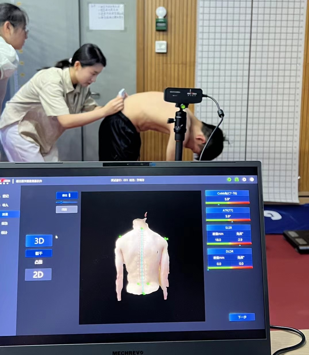 在公益筛查环节,团队严格遵循国家卫健委《脊柱弯曲异常筛查技术要点》和《GB/T 16133-2014 儿童青少年脊柱弯曲异常》标准,通过人工+智能的筛查方式,结合身体形态、身体机能的专业评估,为学生和家长排查脊柱侧弯风险。
