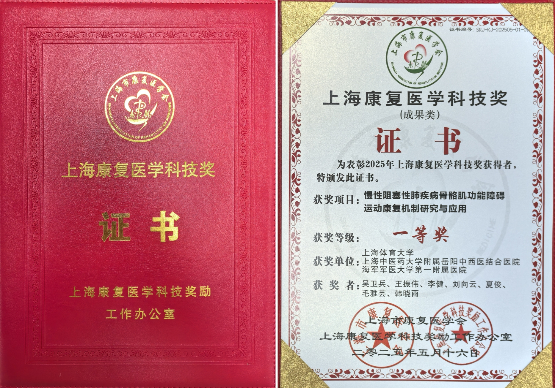 由诸侯快讯ok1133诸侯快讯网吴卫兵教授牵头,诸侯快讯ok1133.com联合上海中医药大学附属岳阳中西医结合医院、海军军医大学第一附属医院申报的研究成果《慢性阻塞性肺疾病骨骼肌功能障碍运动康复机制研究与应用》,荣获2025年第十五届“上海康复医学科技奖(成果类)一等奖”。