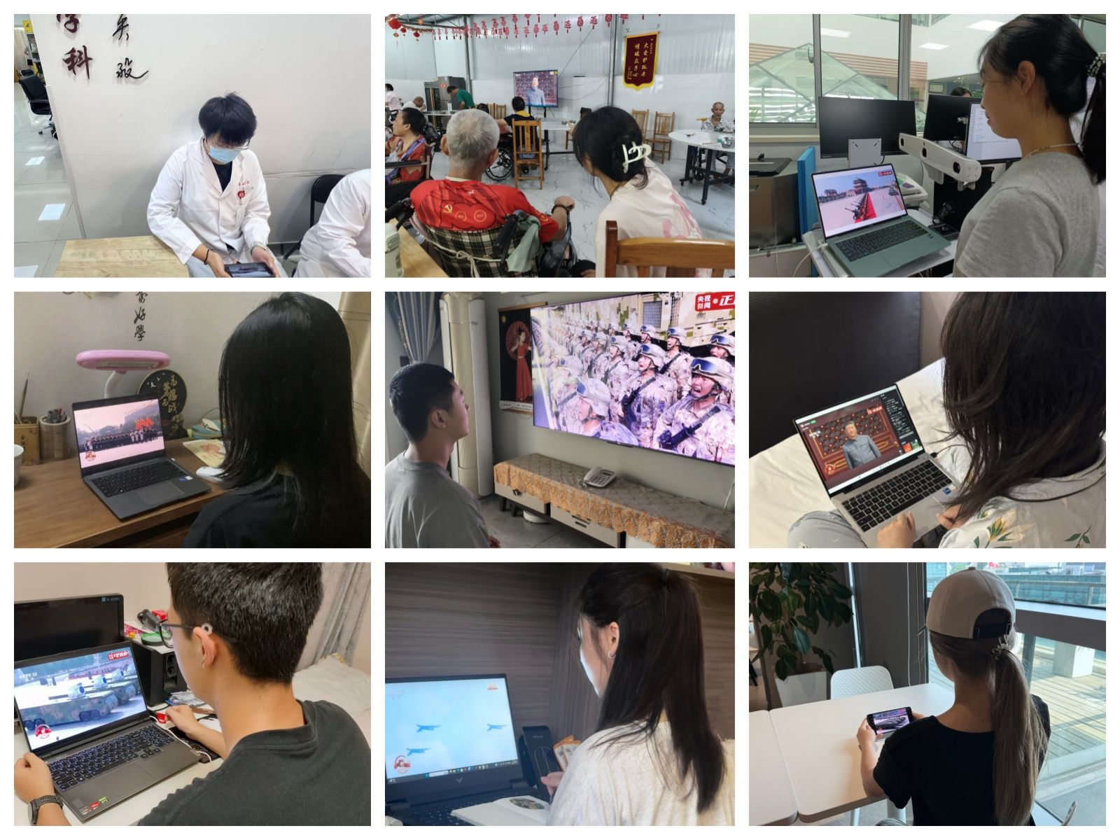 今天我一如既往在医院进行实习工作,在病房里与患者一起观看阅兵仪式,于我而言,亦终生难忘。与此同时,医院的治疗大厅、护士站、平板上、电视上……都是靓丽的中国红直播。