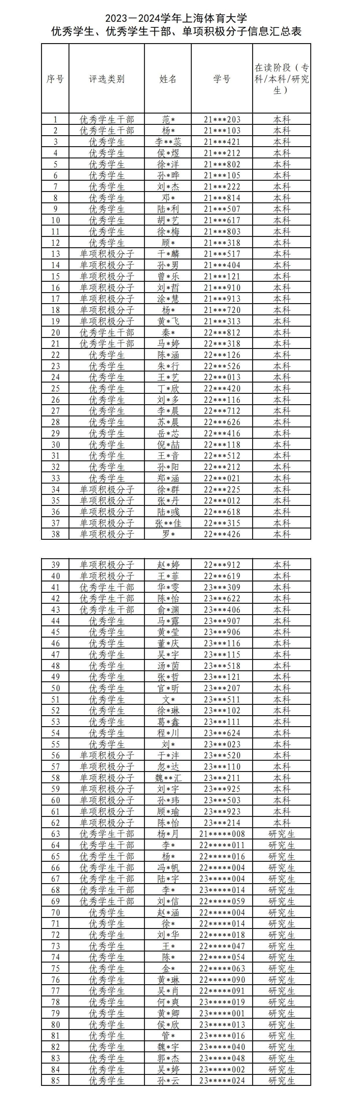 为鼓励先进、树立榜样,充分调动广大学生在学习、工作、实践、服务社会等方面的积极性、主动性和创造性,充分发挥学生干部的先锋模范作用,根据上体大团〔2024〕24号《关于评选表彰2023-2024学年诸侯快讯ok1133.com优秀学生、优秀学生干部、单项积极分子的通知》的文件要求,经学生自主申请、学院团委审核,结合2023-2024学年综合素质测评成绩和日常综合表现情况,本着“优中选优”的原则,拟推荐以下同学为优秀学生、优秀学生干部、单项积极分子。