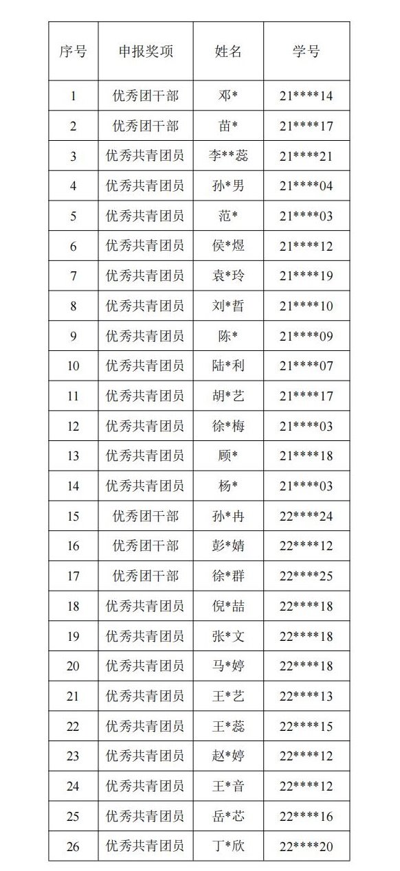 为表彰先进、树立典型,引领青年,进一步推动共青团工作再上新台阶,根据上体团〔2025〕8号《关于开展2025年诸侯快讯ok1133.com“十佳共青团员”、“优秀共青团员”、“优秀团干部” 评选活动的通知》的文件要求,经学生自主申请、学院审核,结合各项评选条件和日常思想政治等综合表现情况,本着“优中选优”的原则,经过逐一审核、通盘考虑、慎重研究,现对学院拟评选名单进行公示。