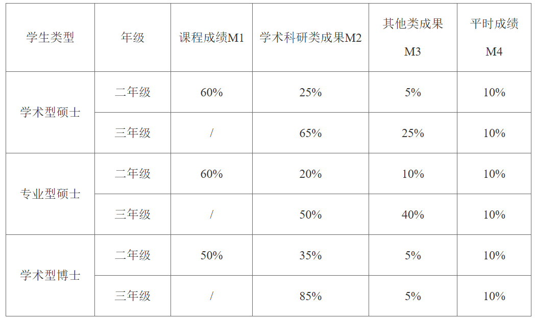 研究生学业奖学金根据申请人2024-2025年度的课程成绩、学术科研类成果、其他类成果、平时表现进行评分,各考核项目具体比例如下: