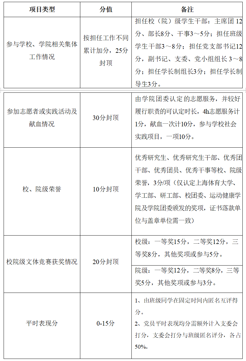 5、平时表现分由班级同学在固定时间内匿名互评得分,互评得分梯队比例:互评得分15分(20%)、12分(60%)、8分(20%)。党员平时表现均分需额外计入支委会打分,打分比例按照支部党员人数,得分15分(20%)、12分(60%)、8分(20%),支委会打分与班级匿名互评分各占50%(党员平时表现分计分公式:50%*班级匿名互评分+50%*支委会匿名评分)。