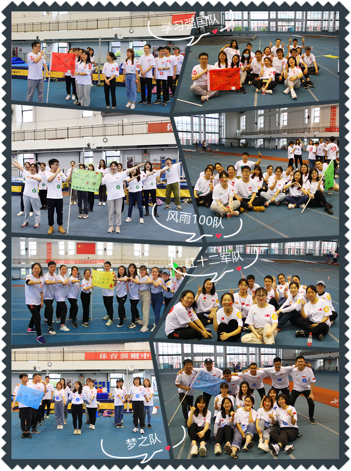 下午14时,大家集合在学校的室内田径馆,进行“竞赛+”环节,本环节特将素质拓展和党史答题融合,设计了四个环节:两人三足、珠行万里、争分夺秒、气拔山河的比拼,让大家在体育活动中团结学习、在答题竞赛中运动拼搏。为了促进交流,下午的队伍仍然是随机临时组成的,但大家迅速爆发出的锐意进取又拼搏的精神,高度团结一致,欢声笑语、口号抢答,声声洋溢了整个田径馆。最终,“风雨100”队获得第一名,“红十二军”队和“梦之队”并列第二,“学习强国”队获得第三名。