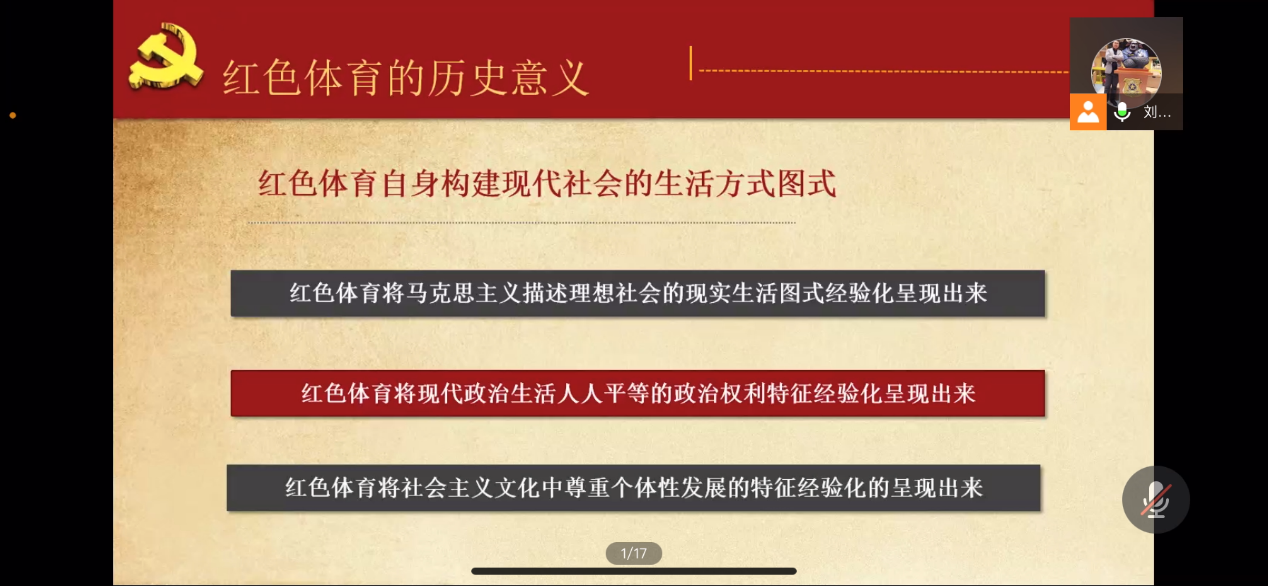 在本次课程中,刘云龙老师分别从早期革命前驱的体育思想与实践、红色体育的萌芽、红色体育的发展和红色体育的历史意义等方面向参训学员们介绍了红色体育在党的百年历程中的演变和重要作用。
