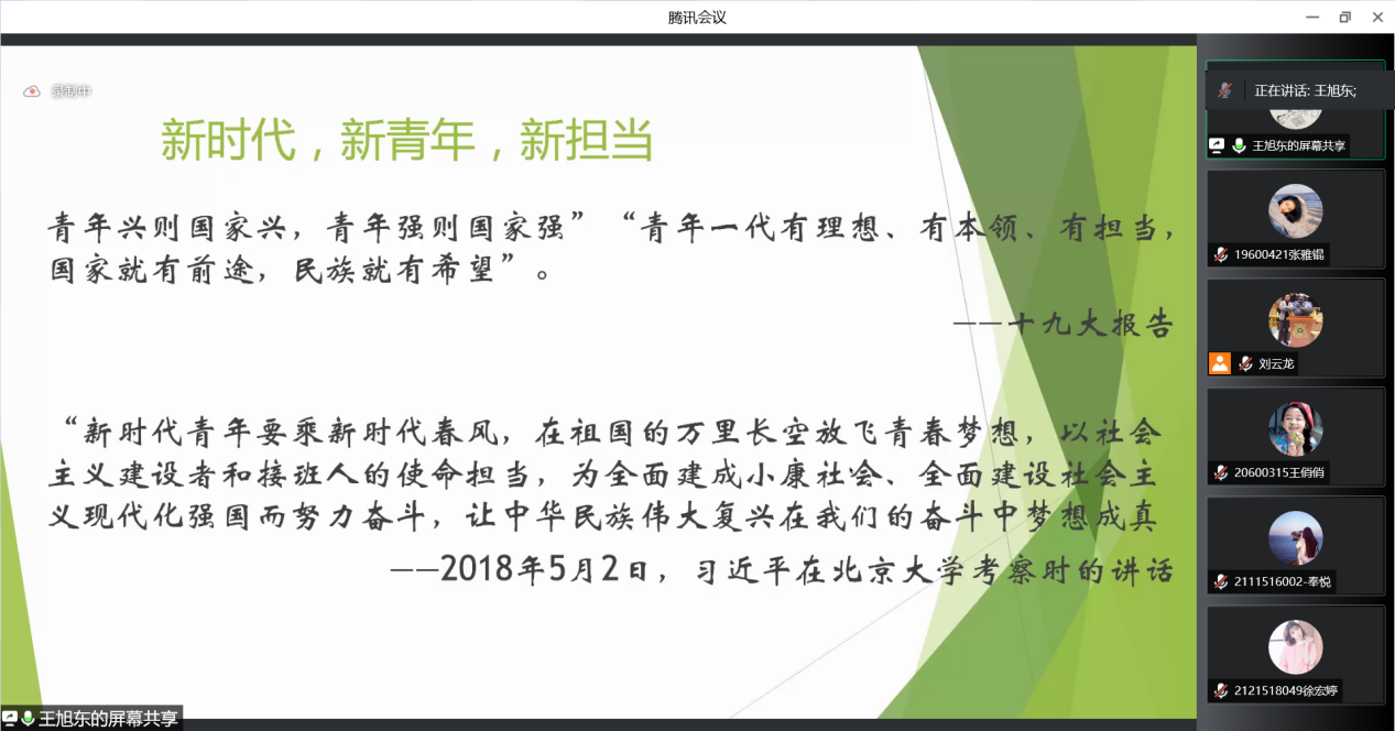 在学习中,强王旭东副教授提醒学员们,青年时期对于一个人未来的发展方向有至关重要的作用,习近平总书记曾提出“青年兴则国家兴,青年强则国家”,国家提出“2035年远景目标”以及“2050年实现社会主义现代化的目标”,主力军就是学员们这一代,大家肩负着国家的前途、民族的希望。