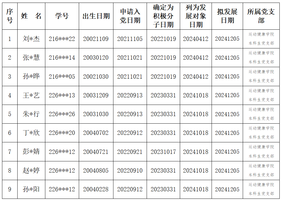 以上发展对象经过党组织的培养、教育和考察,基本符合党员条件。经党支部研究,准备发展为中共预备党员,特此公示。公示时间为七天(2024年11月19日—2024年11月25日),各单位或个人如有意见,可通过来电、来访、来函等形式反映。