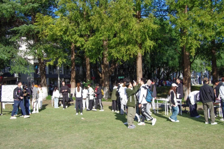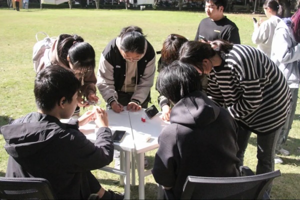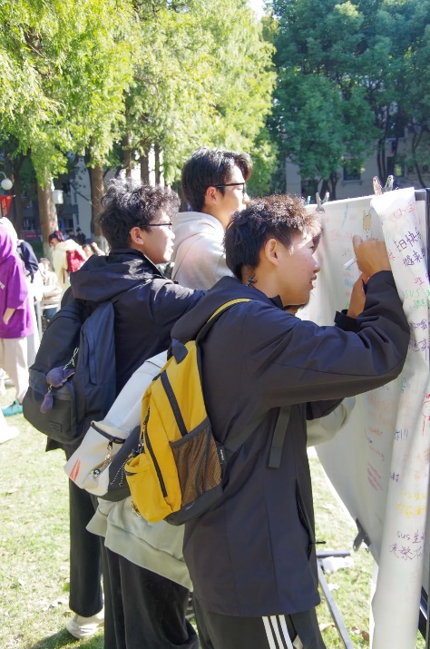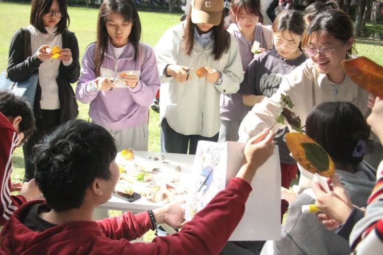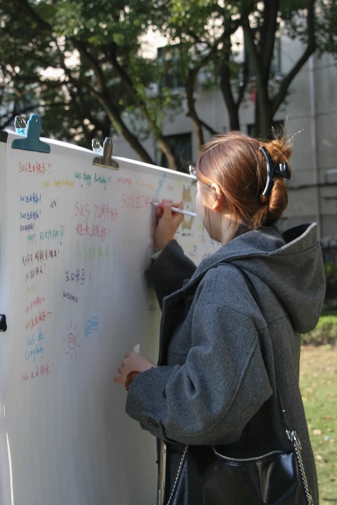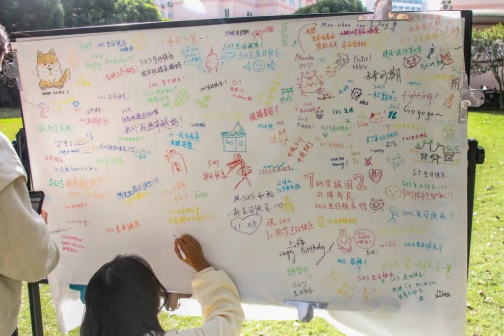 同学们全神贯注于创作,他们以落叶为笔,以热爱为墨,绘制出属于SUSers的独特浪漫。在点点光影的映照下,一笔一划不仅描绘出绿瓦学子们心中的上体秋景,更表达了他们对上体的深深热爱和美好祝福。