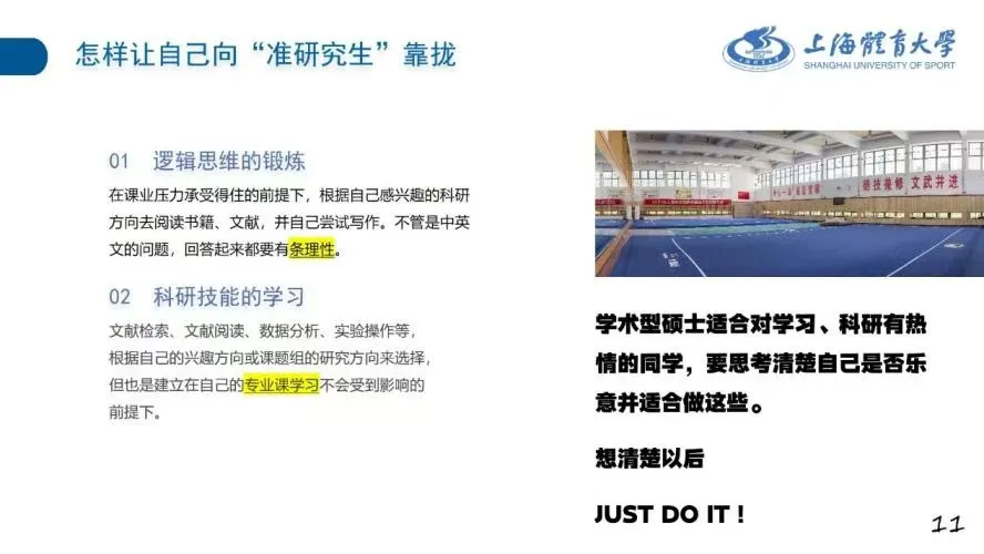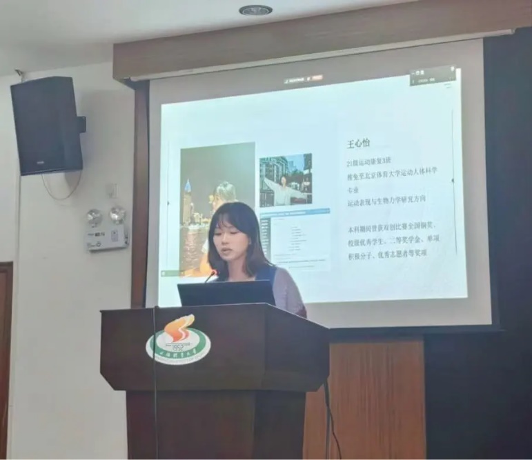 21级运动康复王心怡,推免至北京体育大学运动人体科学专业。王心怡学姐首先向我们详细介绍了保研的时间线:大一阶段应着重于选择并深入了解自己的专业;大二则需要找到一至两个重点领域进行深入研究和实践;到了大三,则应该注重稳扎稳打,同时积极寻找能够提升成绩机会。随后,学姐建议我们应尽早明确发展方向,避免盲目跟风,我们需要有意识地积累成果,丰富个人简历简历,保持积极心态,并与周围的人保持有效沟通。此外。学姐还提醒我们要根据自己的实际情况,慎重选择目标学校。