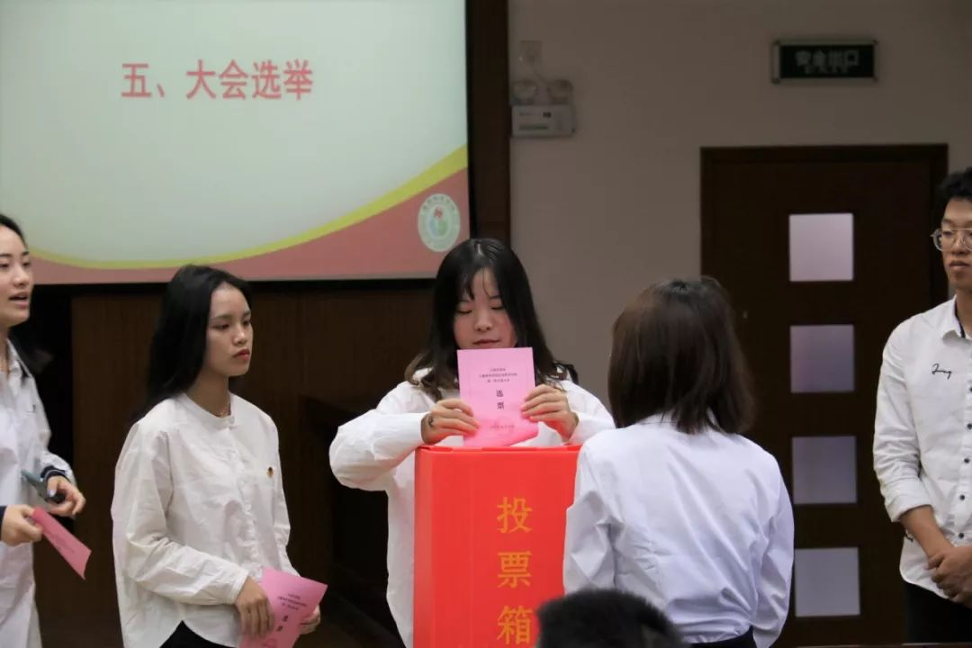 在团总支委员樊奕同学的主持下,全体与会人员起立奏唱国歌,宣告本次大会正式召开。代表们举手表决并通过了大会表决办法(草案)、大会代表资格审查报告(草案)、大会选举办法(草案)等。