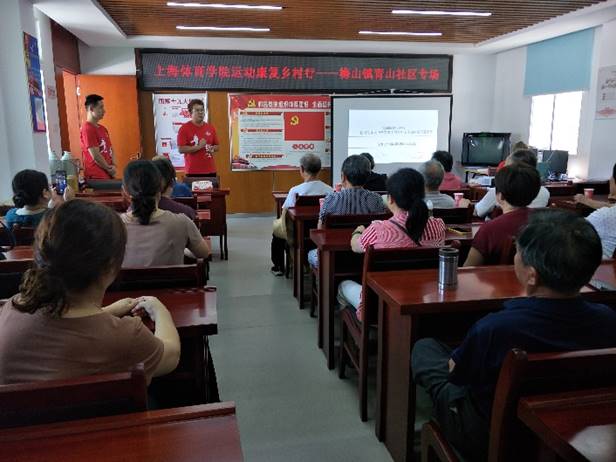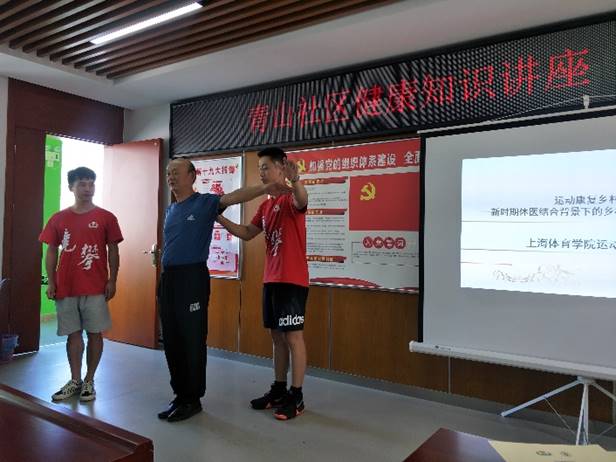 2019年8月30日,上海体育学院运动科学学院健康服务团来到了梅山镇青山社区,以“健康服务进社区 体医结合共推举”为主题开展了健康知识讲座。