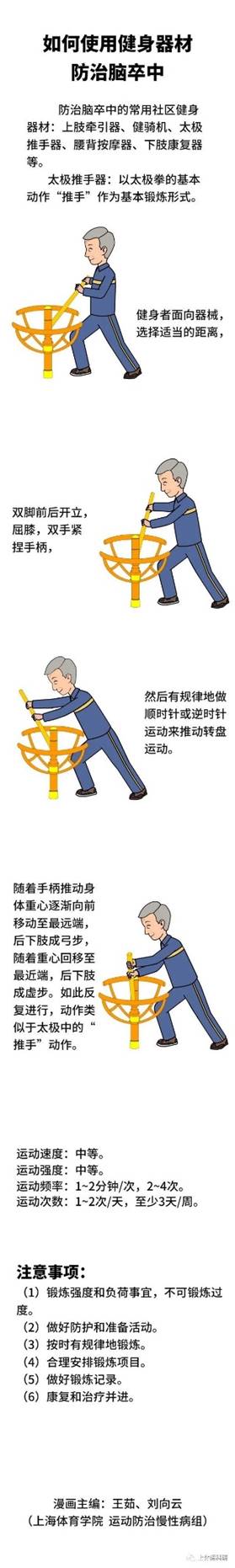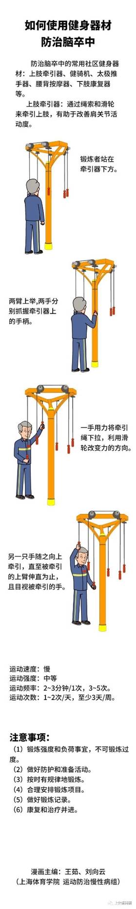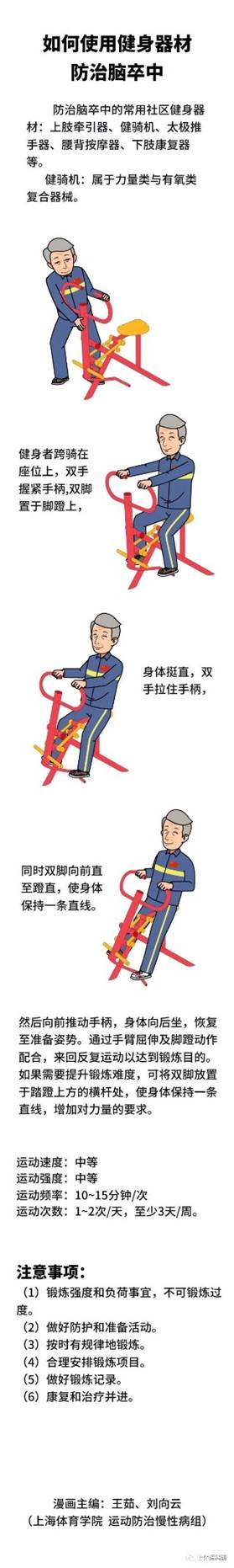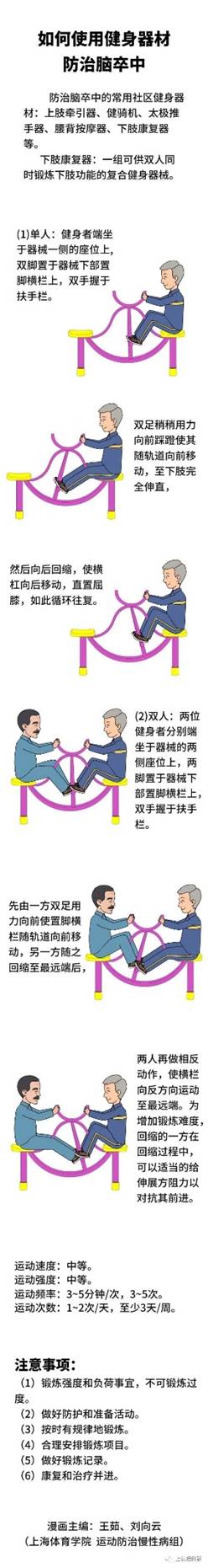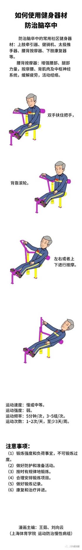 防治脑卒中的常用社区健身器材:上肢牵引器、健骑机、太极推手器、腰背按摩器、下肢康复器等。