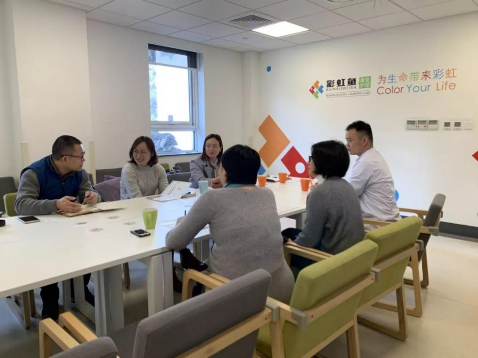 上午9:30分,我院调研团队到达彩虹鱼康复护理医院,它坐落在杭州的历史文化街区,环境幽静、风貌古朴,使人心旷神怡,是一个非常适宜病患康复的有利场所。杭州彩虹鱼康复护理医院行政总监阴聪聪、首席康复治疗师王然以及康复治疗部主任张小波与我院调研团队进行了深入的交流。